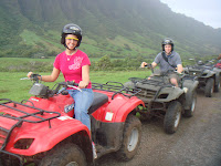 I picked one and Jared picked the other. We went with The ATV tour, (Jared picked this one) and I picked the Ocean Voyaging tour. Saturday morning we woke up bright and early at 6:30am to it pouring down rain outside. I was panicking because the ATV tour was first. We had to be there at 8:30am and they go out rain or shine and I really didn't want to ride in the rain. Thankfully be time we got there and the tour started the rain had passed. It was still muggy out but, that didn't stop us at all from having a blast. From driving through the water puddles, up and down many trails and even stopping off to see where some past movies have been filmed, such as 50 First Dates, Jurassic Park, Lost, You Me & Dupree, so many others. I had the best time ever just riding around, the company was amazing and the scenery was just as breath taking.